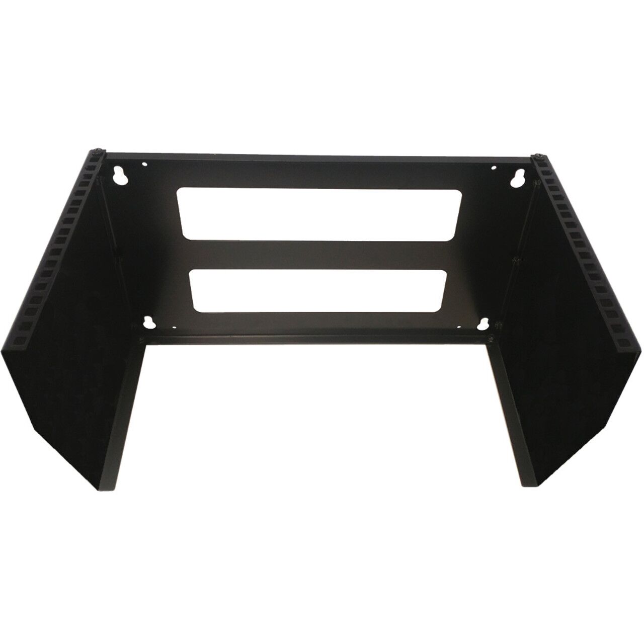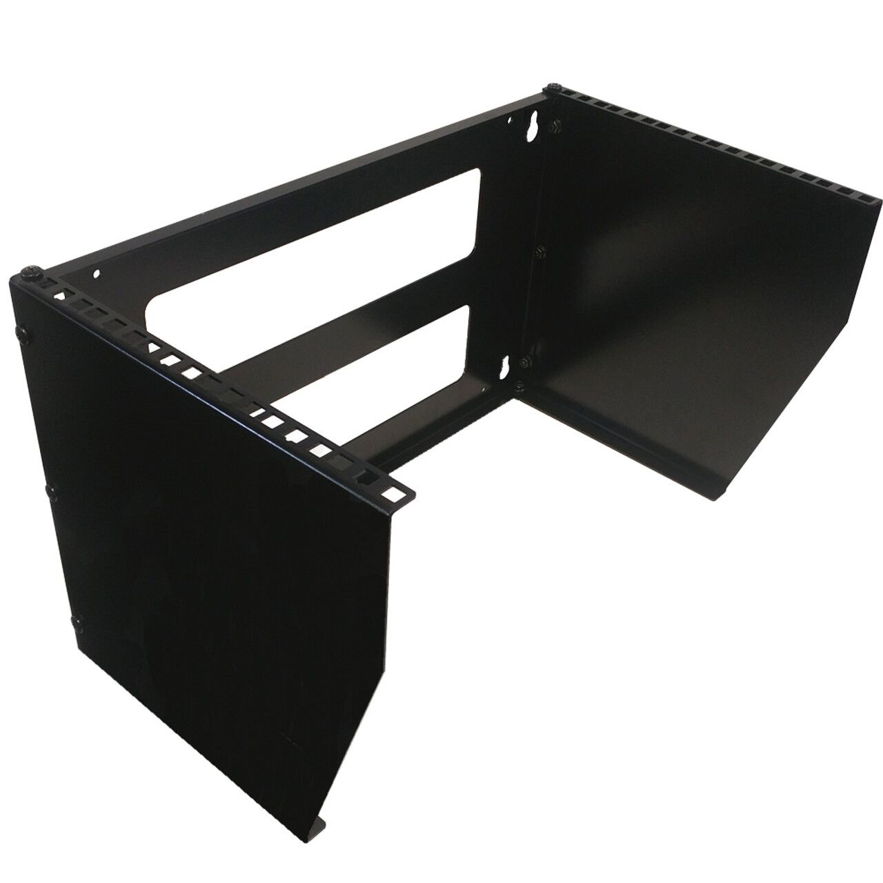 This vertical wall mount rack is 6U in depth. It is used for mounting 19″ wide networking equipment vertically. Works well in a small office or home where space is limited.