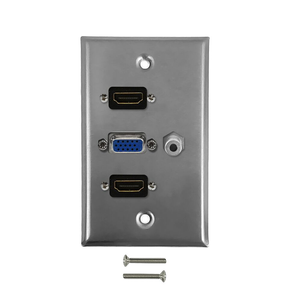 This stainless steel wall plate kit consists of a wall plate, a VGA female to female port, a 3.5mm audio female to female port, and 2x HDMI female to female ports. It is compatible with standard North American electrical openings, data clips or surface mount boxes.