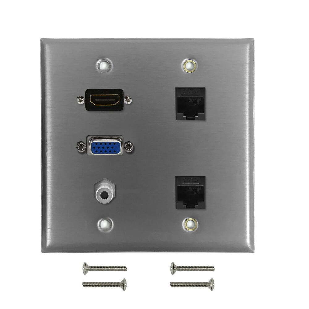 This stainless steel wall plate kit consists of a wall plate, a VGA female to female port, a 3.5mm audio female to female port, a HDMI female to female port, and 2x CAT6 female to female ports. It is compatible with standard North American electrical openings, data clips or surface mount boxes.