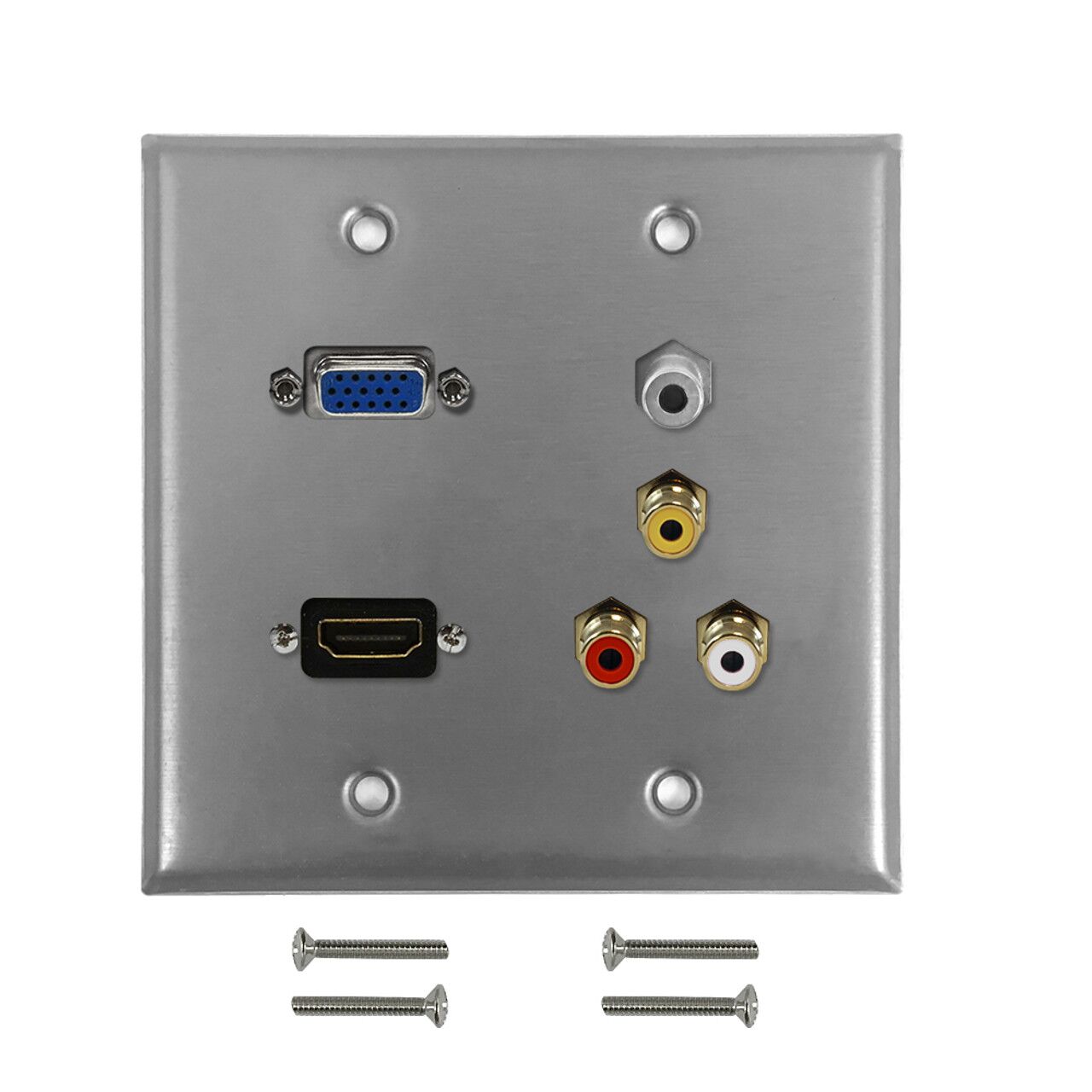 This stainless steel wall plate kit consists of a wall plate, a VGA female to female port, a HDMI female to female port, a 3.5mm audio female to female port, and 3x RCA Composite with Audio female to female ports. It is compatible with standard North American electrical openings, data clips or surface mount boxes.