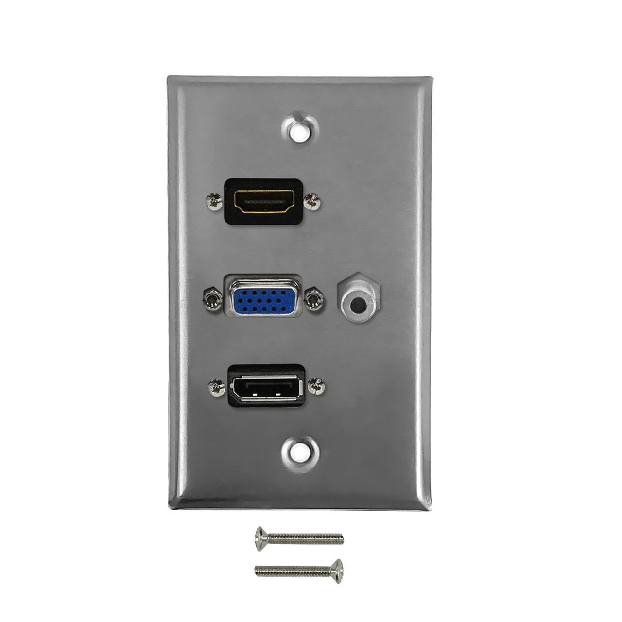 This stainless steel wall plate kit consists of a wall plate, a VGA female to female port, a HDMI female to female port, a Displayport female to female port and a 3.5mm audio female to female port. It is compatible with standard North American electrical openings, data clips or surface mount boxes.