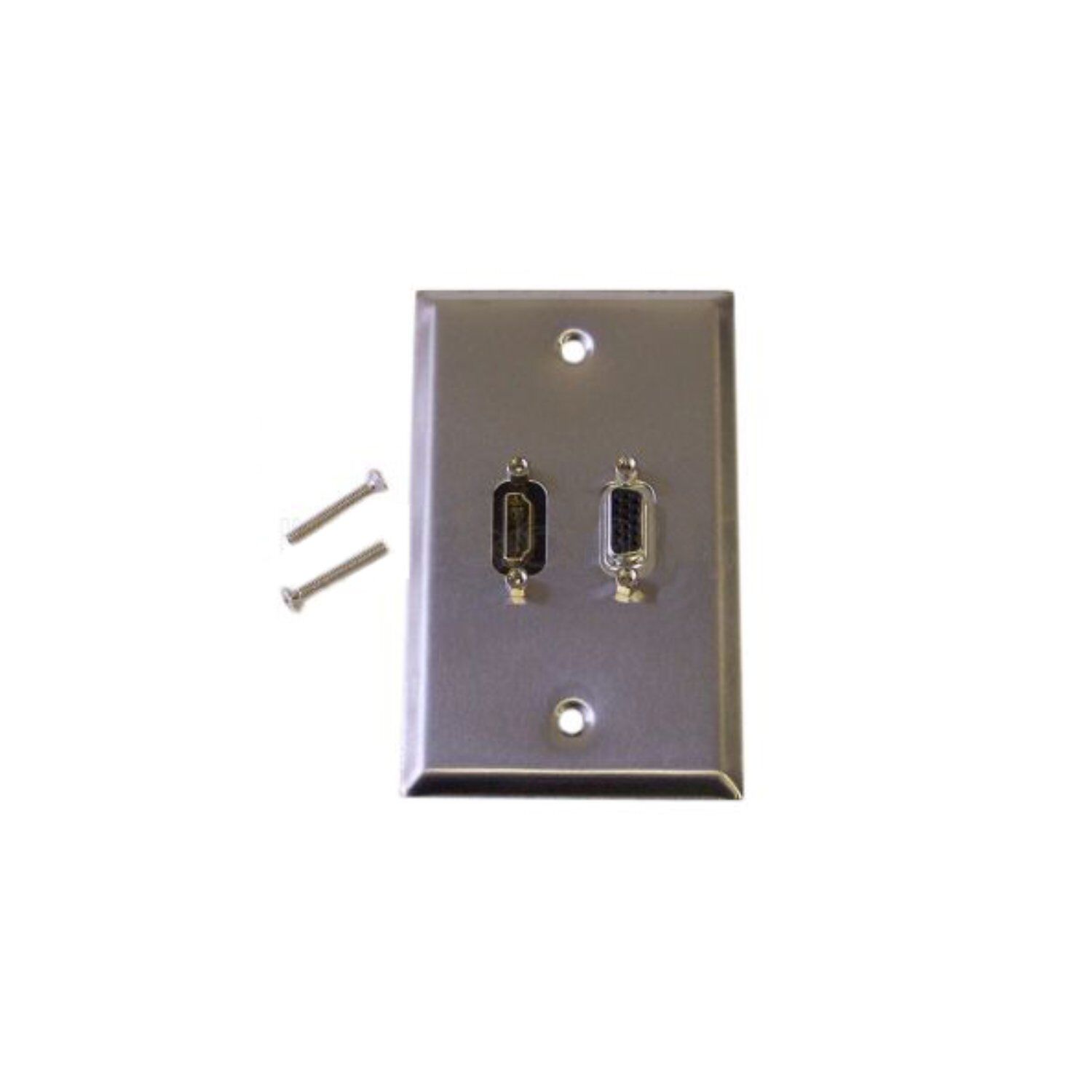 This stainless steel wall plate kit consists of a wall plate, a VGA female to female port, and a HDMI female to female port. It is compatible with standard North American electrical openings, data clips or surface mount boxes.