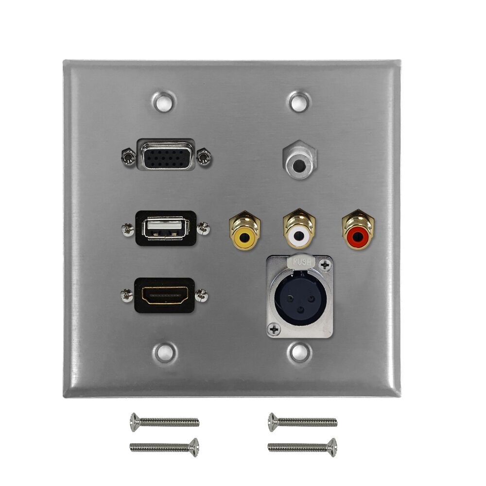This stainless steel wall plate kit consists of a wall plate, a VGA female to female port, a USB female to female port, a HDMI female to female port, a 3.5mm audio female to female port, 3x RCA Composite (YRW) female to female ports, and a XLR female to female port. It is compatible with standard North American electrical openings, data clips or surface mount boxes.