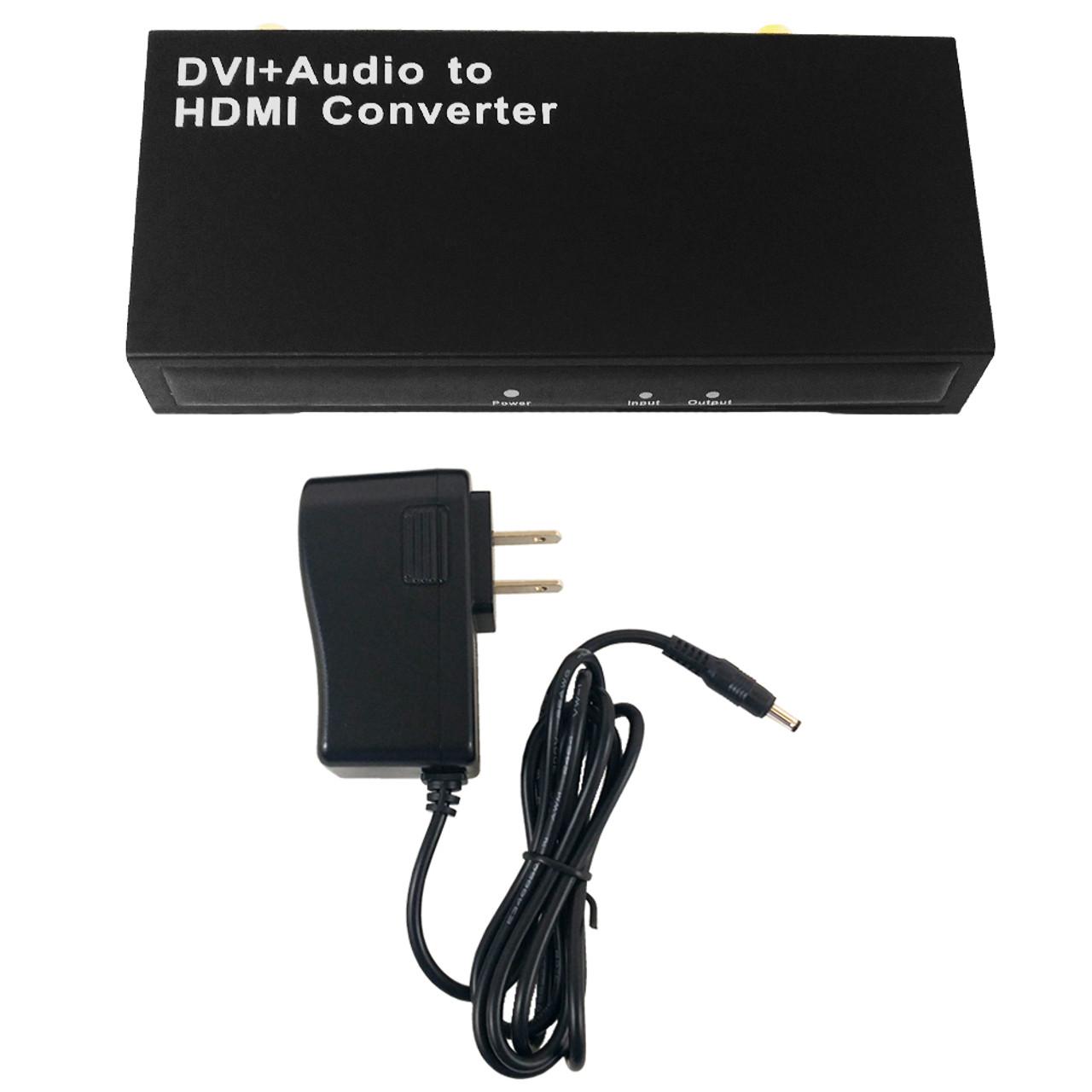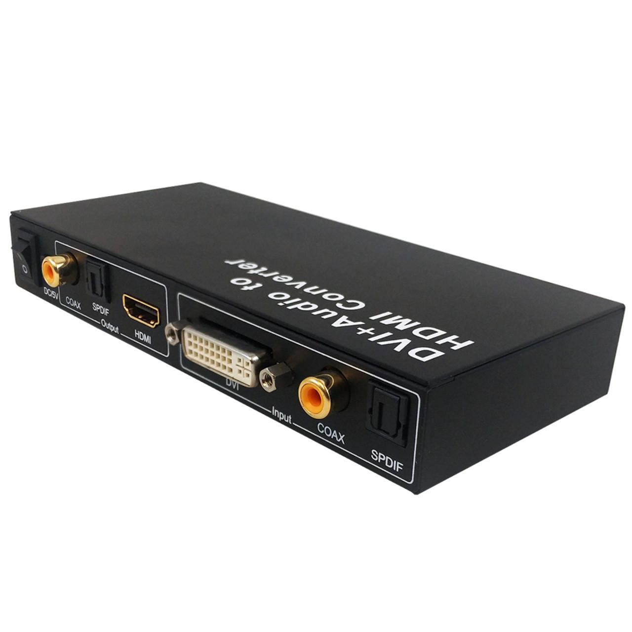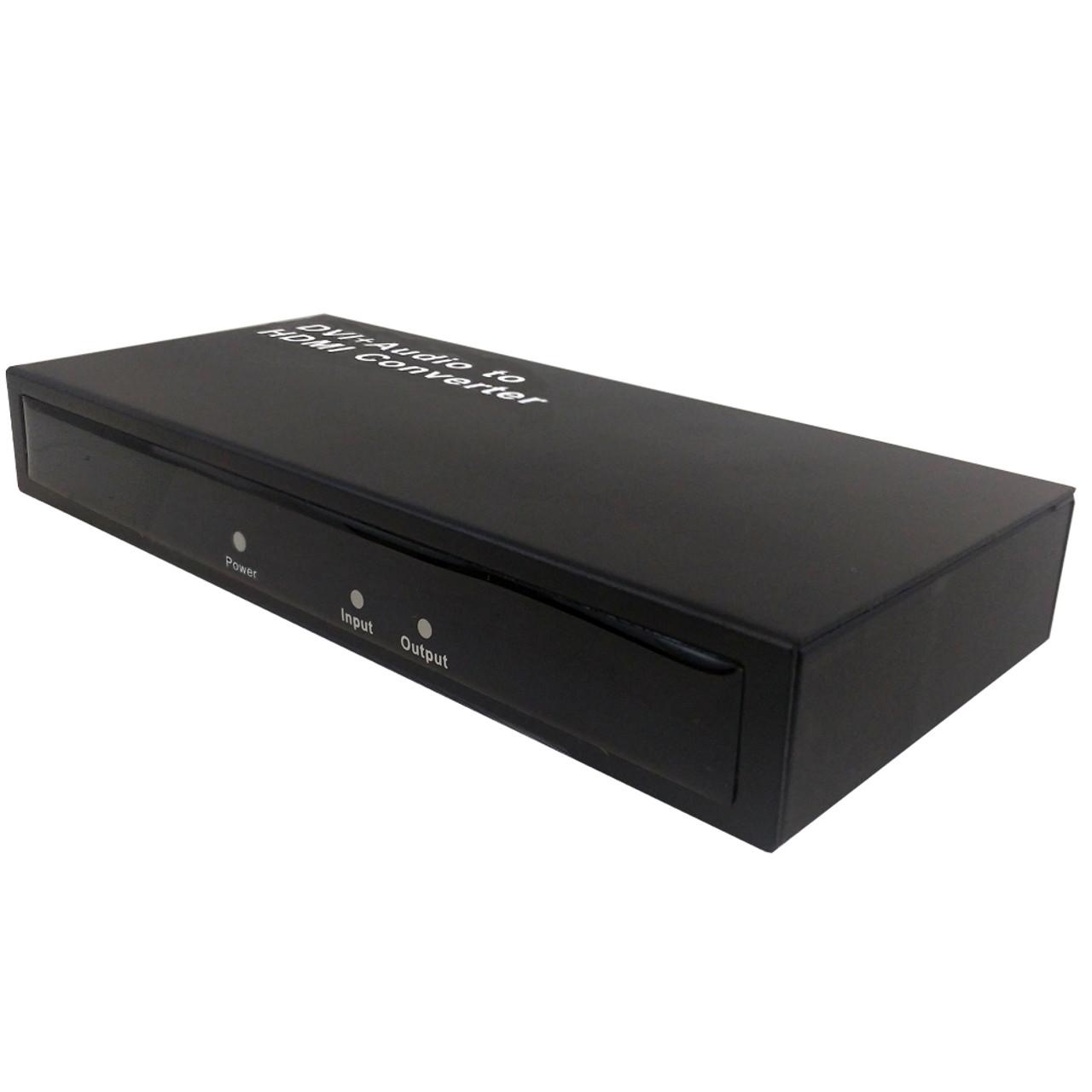 This DVI plus digital audio to HDMI converter combines a DVI video signal with either a toslink or digital coax audio signal into a HDMI signal. It is commonly used for seamless integration to a home theatre system.