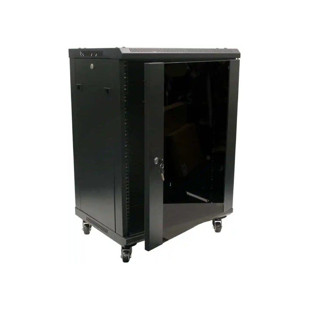 This 18U wall mount cabinet comes with a lockable front door and removable side panels and wheels. It is typically used for housing network and DVR equipment used in small offices and homes. (Fans sold separately).