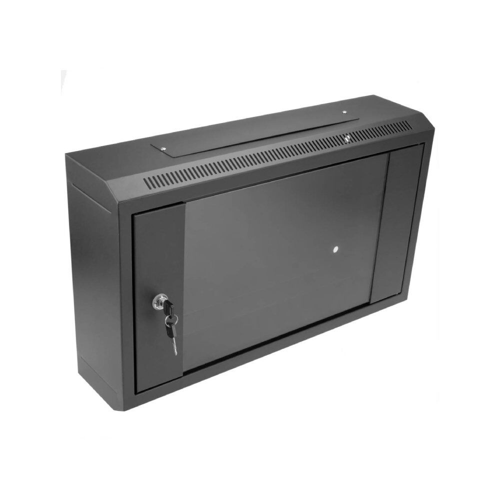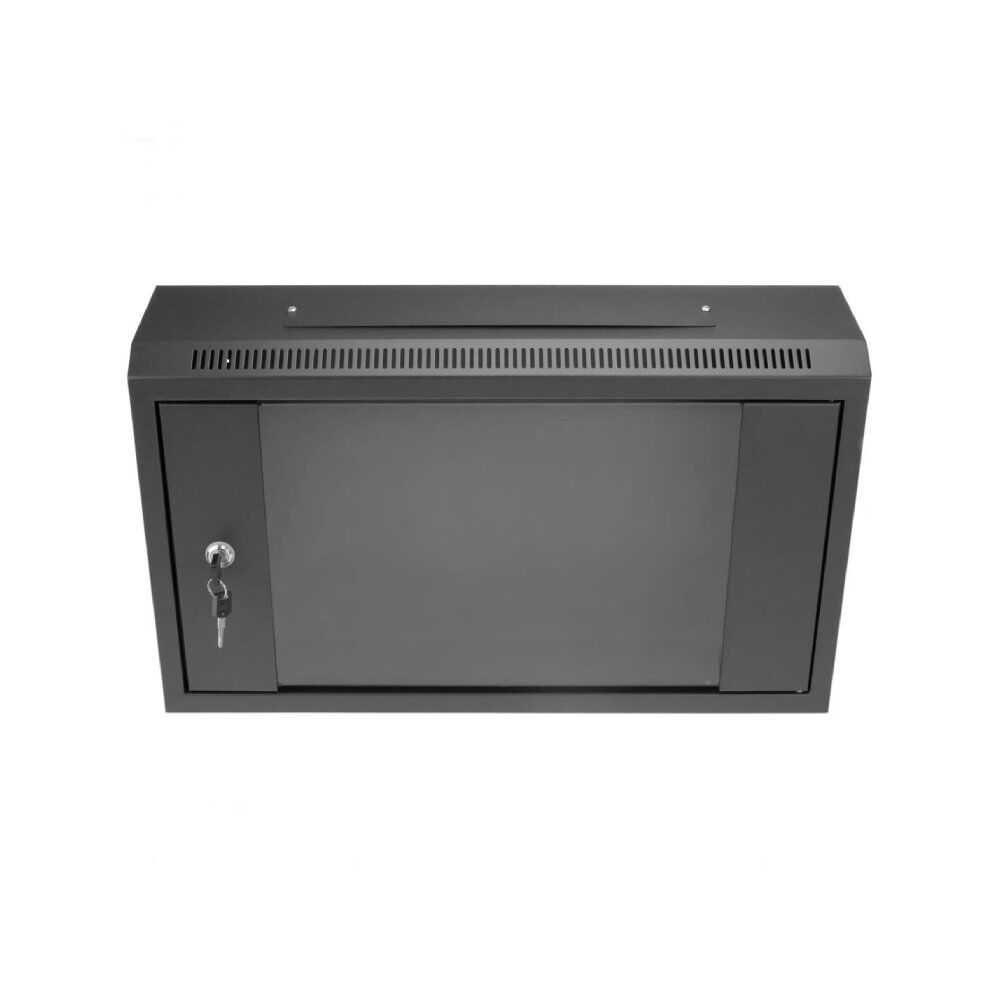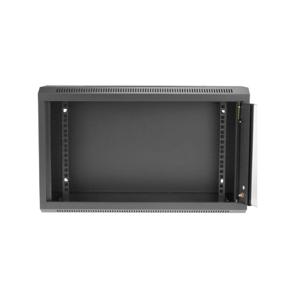 6U wall cabinet and external size in mm of 600 (A) x 150 (D) x 370 (H). It has a single front frame compatible with a 19″ rack and which is configurable in depth (6 levels), although by default it is supplied installed in the center of the cabinet. The distance from the rack to the bottom of the cabinet (useful depth) could be up to 105 mm, moving the rack forward as much as possible.