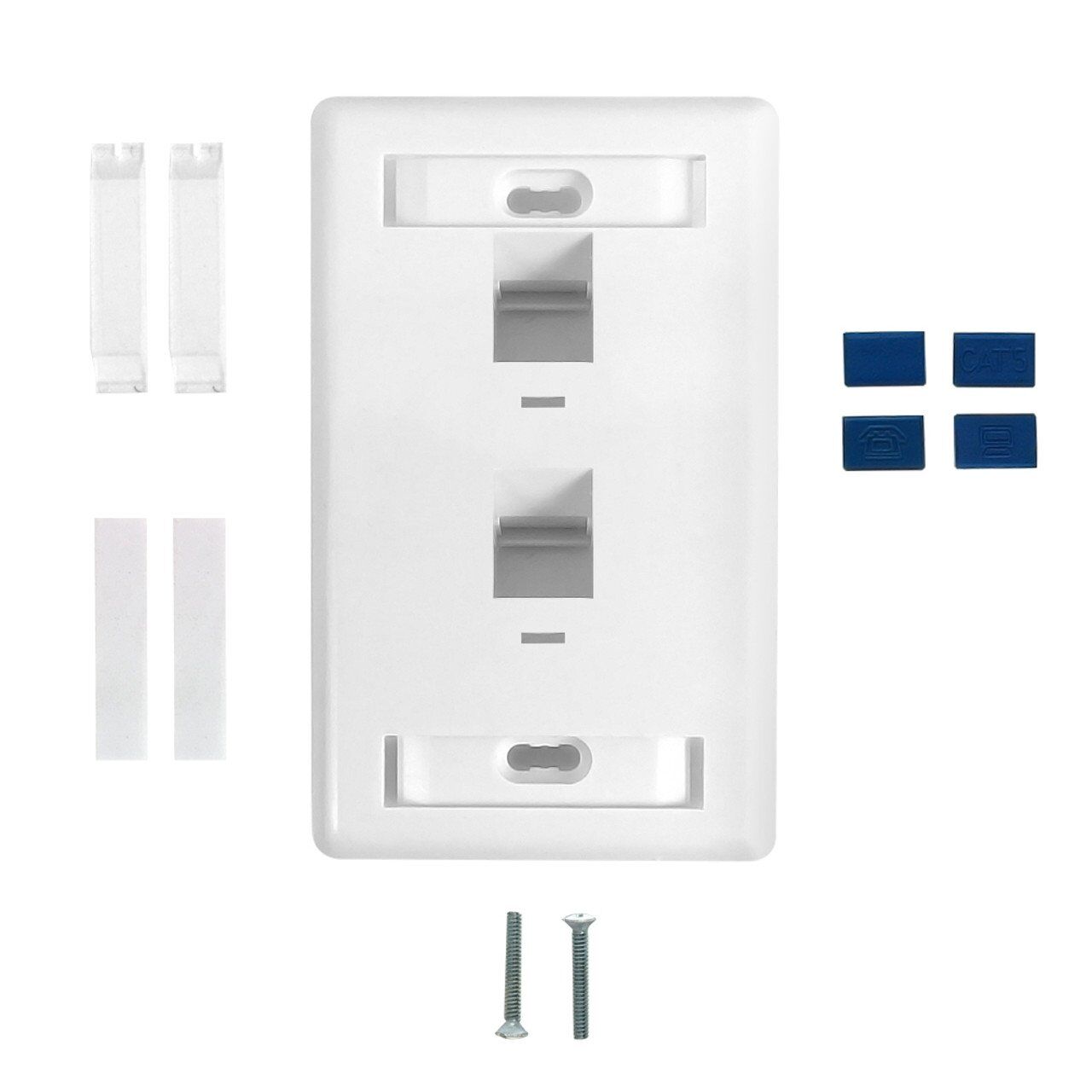 This wall plate consists of 2-port angled keystone openings. It is a standard North American wall plate which accepts a standard keystone insert.