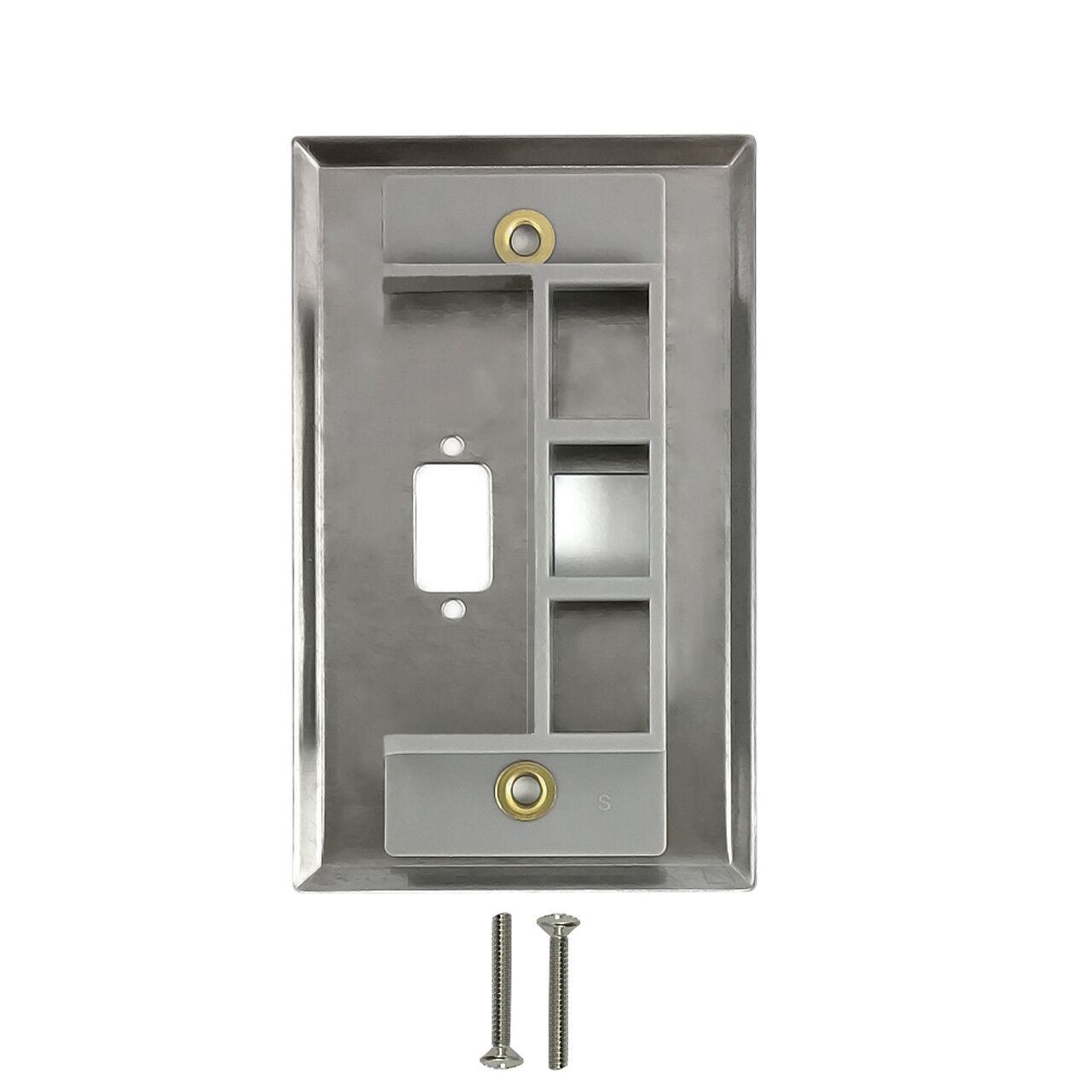 This wall plate consists of one DB9 size opening and one keystone opening. It is a standard North American wall plate which accepts a variety of our DB9 style couplers or dongles (such as HDMI, VGA, USB and DisplayPort), and one keystone opening that accepts a standard keystone insert.