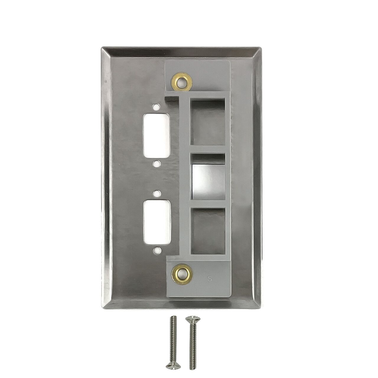 This wall plate consists of two DB9 size openings and one keystone opening. It is a standard North American wall plate which accepts a variety of our DB9 style couplers or dongles (such as HDMI, VGA, USB and DisplayPort), and one keystone opening that accepts a standard keystone insert.