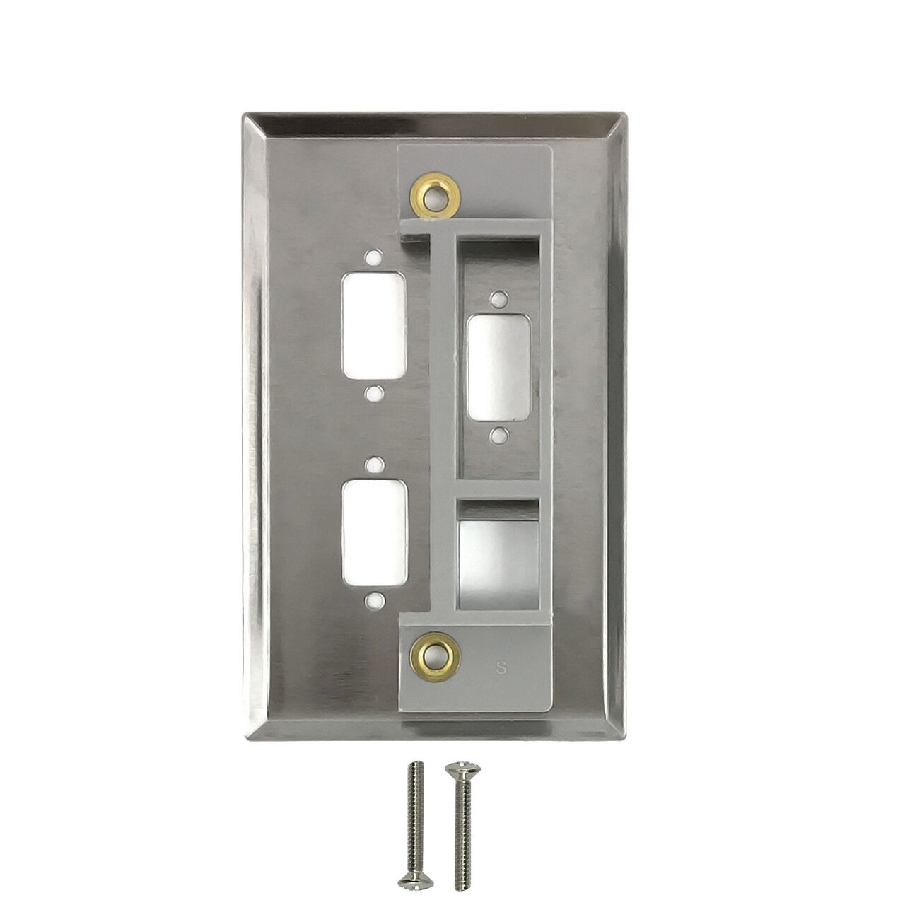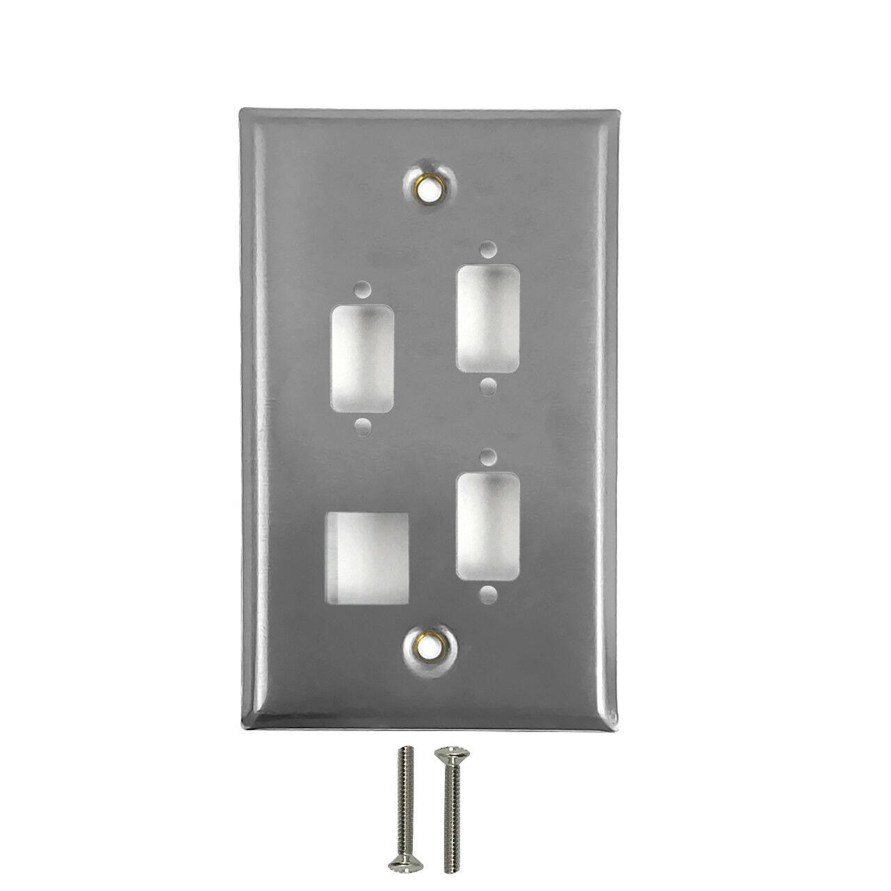 This wall plate consists of three DB9 size openings and one keystone opening. It is a standard North American wall plate which accepts a variety of our DB9 style couplers or dongles (such as HDMI, VGA, USB and DisplayPort), and one keystone opening that accepts a standard keystone insert.