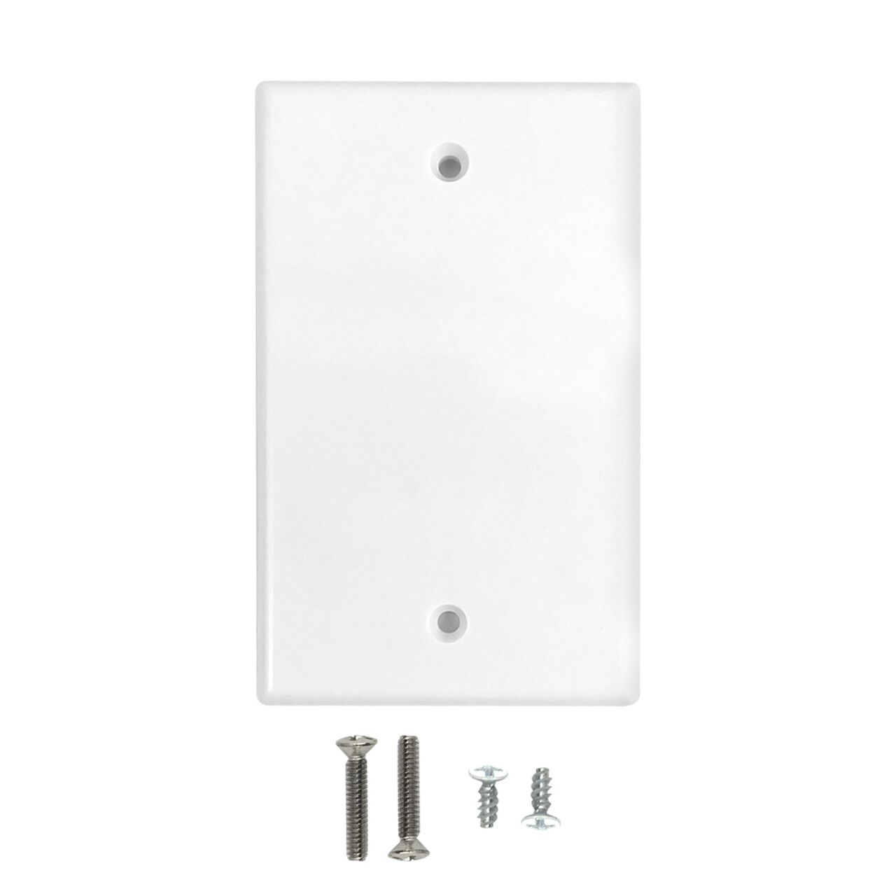This single gang solid cover plate fits standard size North American wall plate openings.
