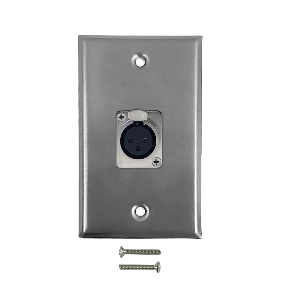 This wall plate kit consists of a wall plate, and a XLR locking female to solder insert. It is compatible with standard North American electrical openings, data clips or surface mount boxes.